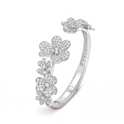 Frivole手镯,7枚花卉主题图案,镀铑18K白金,圆形钻石,中号款式;DEF、IF至VVS级钻石。